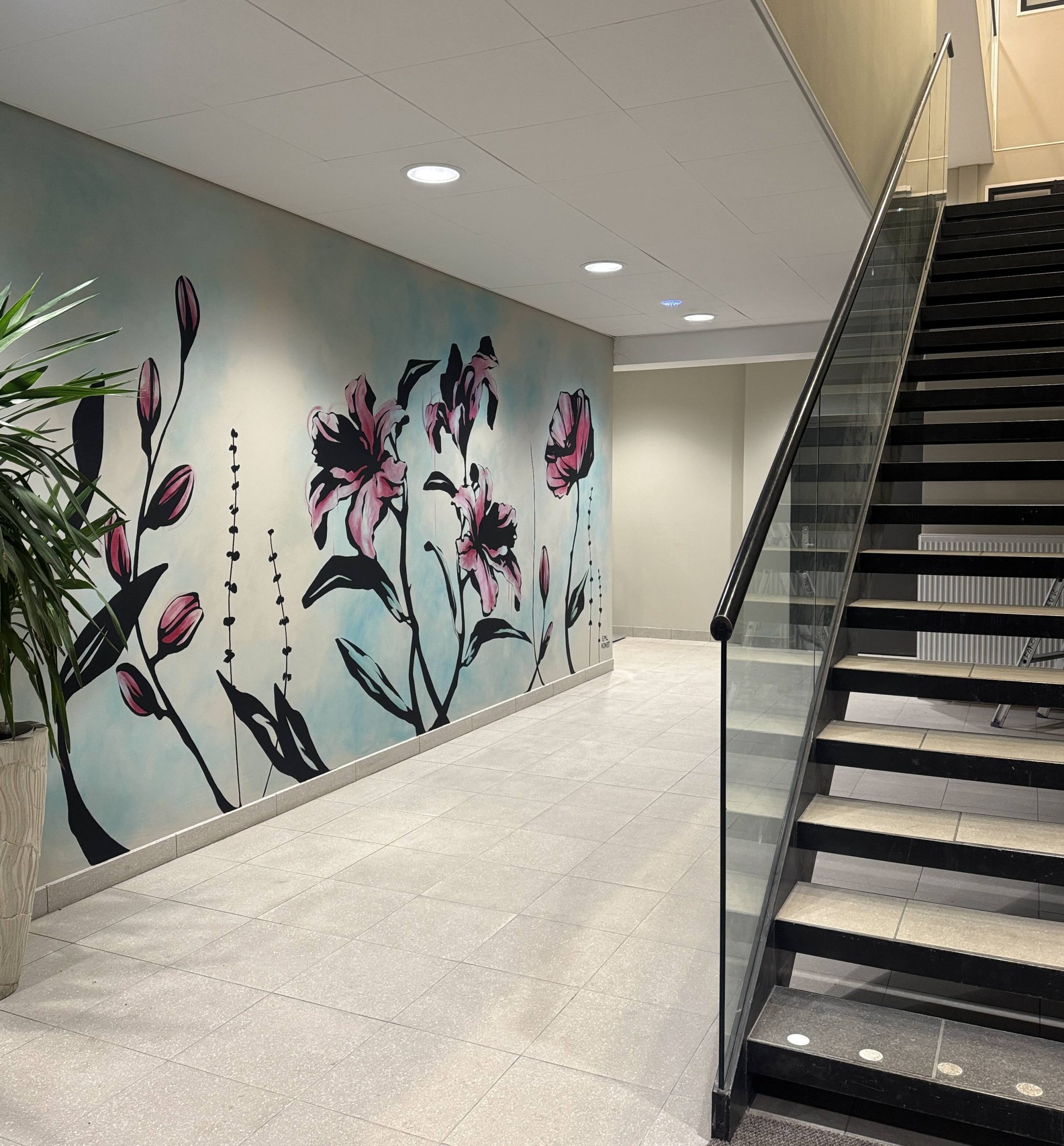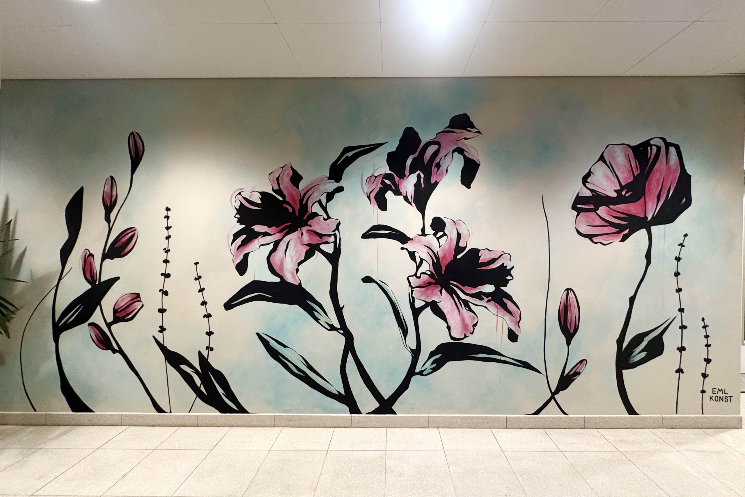 Sent 2025 fick jag frågan om att göra en väggmålning i en av Fabeges nyrenoverade kontorshotell, jag tackade självklart ja och så började vi skissa! Utifrån inspirationsbilderna jag fick tog jag fram en skiss som sedan fick pryda väggen.